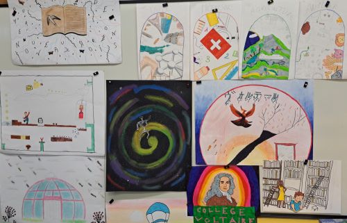 Les élèves de 4e4 et de 4e6 ont continué leur réflexion autour de la réalisation d’une fresque sur le mur de la salle de la permanence du collège en réalisant une série de croquis qui sont exposés en ce moment au CDI.