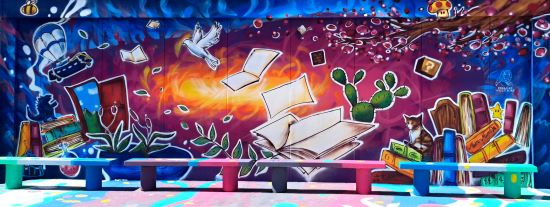 Les « Mur-Mur(e)s » du collège VoltaireZomeka, une artiste de street-art, est venue au collège Voltaire pour aider les élèves de 4e4 et de 4e6 à réaliser une fresque sur le mur de la salle de permanence.
